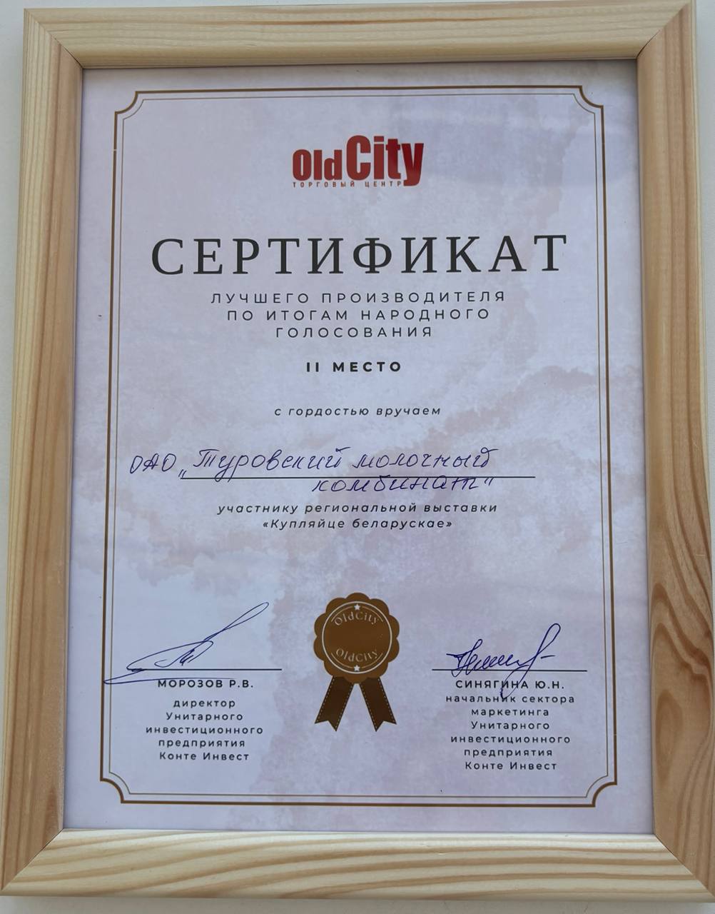 Сертификат Лучшего производителя по итогам народного голосования на дегустации в торговом центре OldCity в Гродно.
