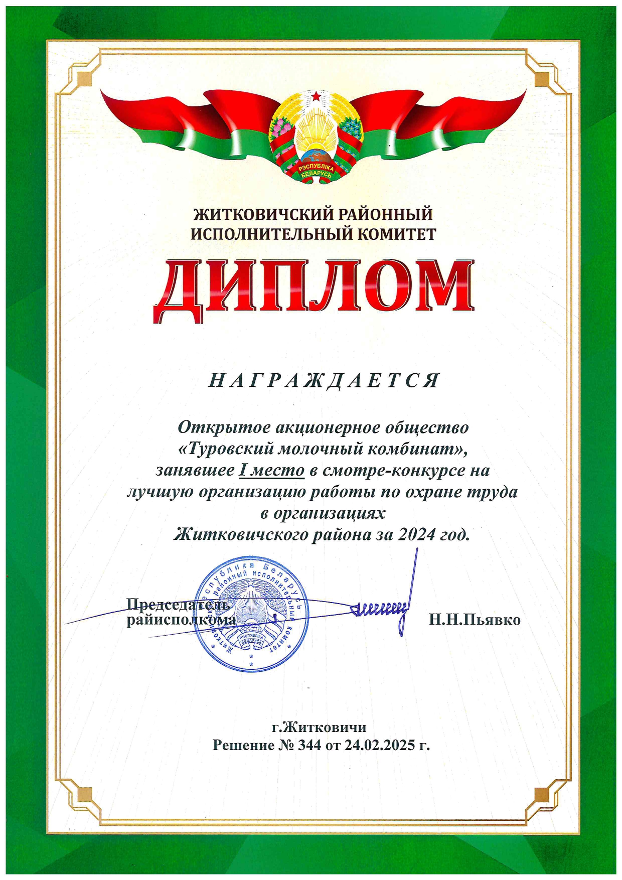 Диплом в смотр-конкурсе на лучшую организацию работы по охране труда в организациях Житковичского района за 2024 год.